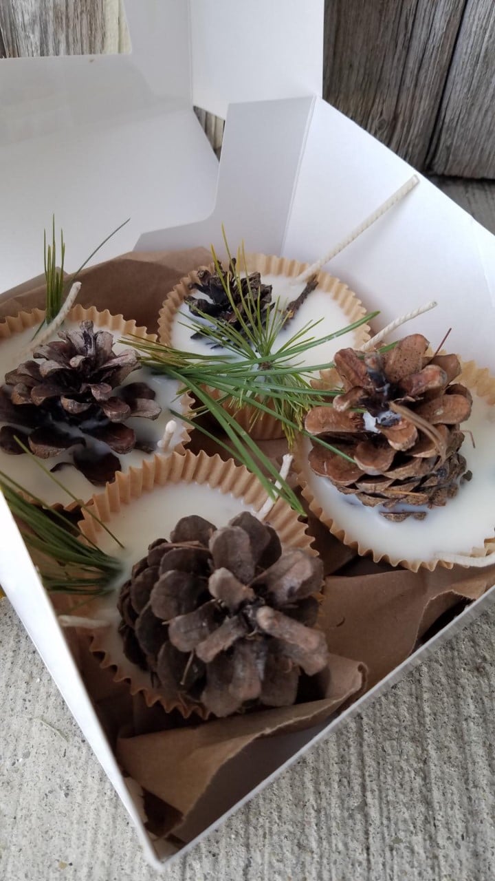 Ingredients: Soy Wax, Kraft Cupcake Liner, Burnable Materials (may include but not limited to paper towels, pine needles, pine cones, nuts, leaves, wood)