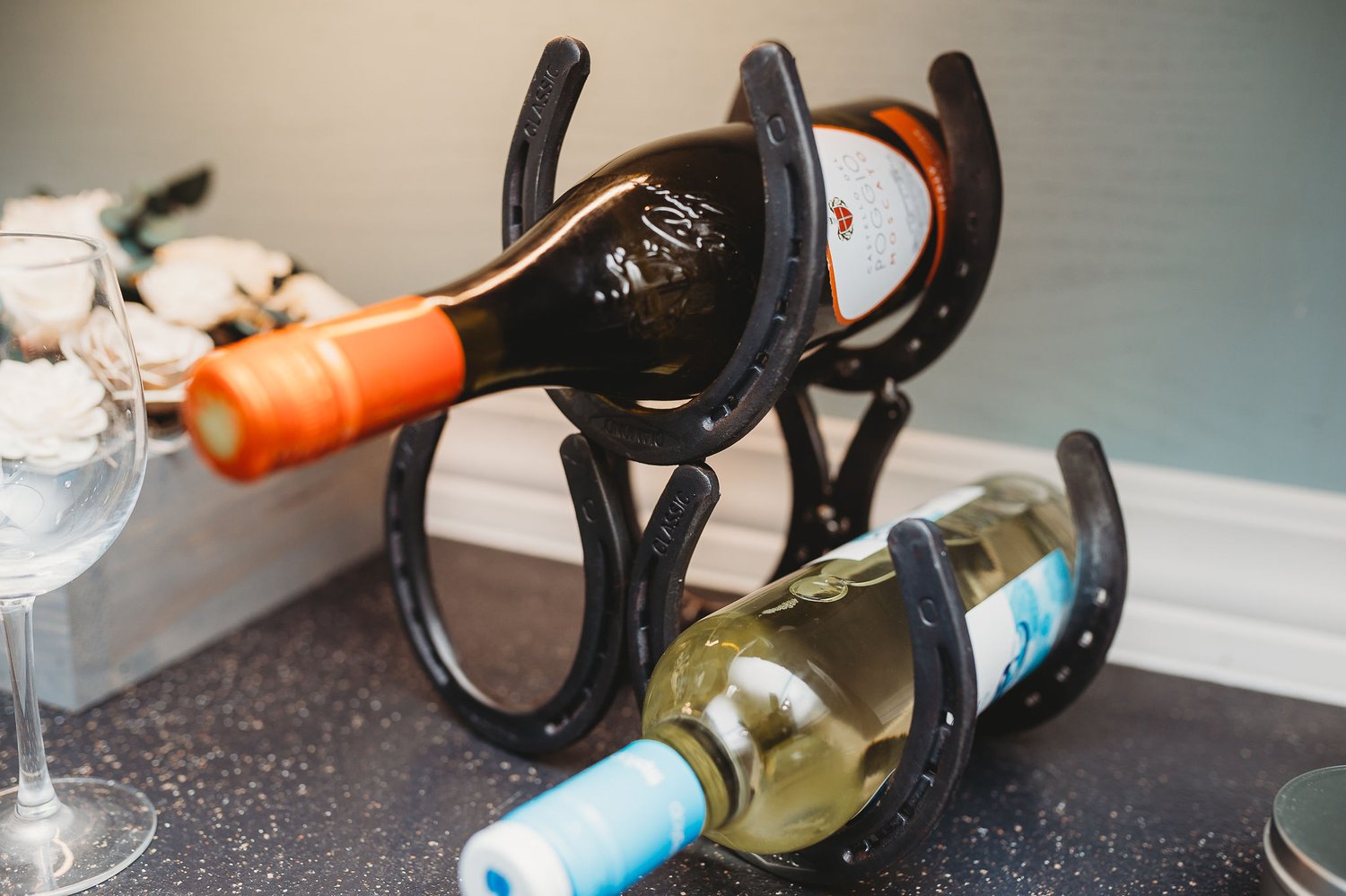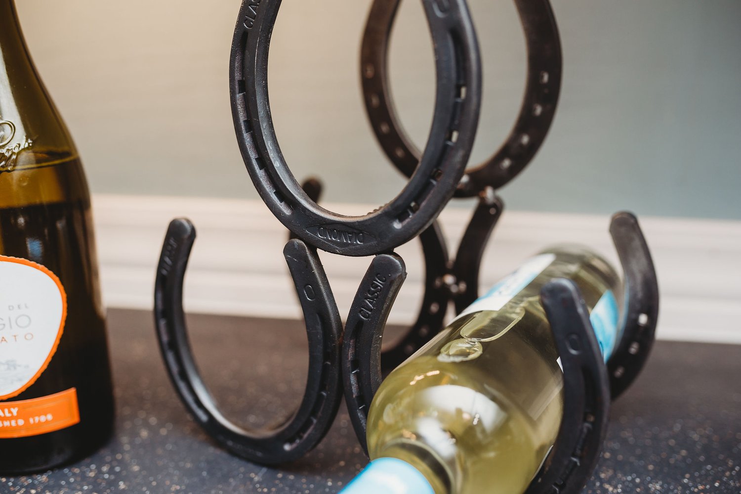 Hand welded horseshoe wine rack holds 3 standard sized bottles of wine. Perfect for gift giving!
